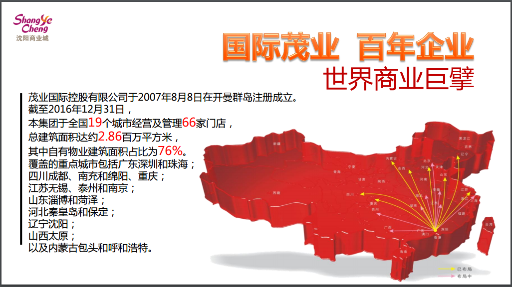 鐘總在向與會嘉賓介紹茂業(yè)國際旗下零售、地產、酒店、物業(yè)4大支柱產業(yè),全國五大區(qū)域30個中心城市戰(zhàn)略布局的同時,重點推介了以沈陽商業(yè)城為代表的沈陽區(qū)域5家重點商業(yè)及地產項目。