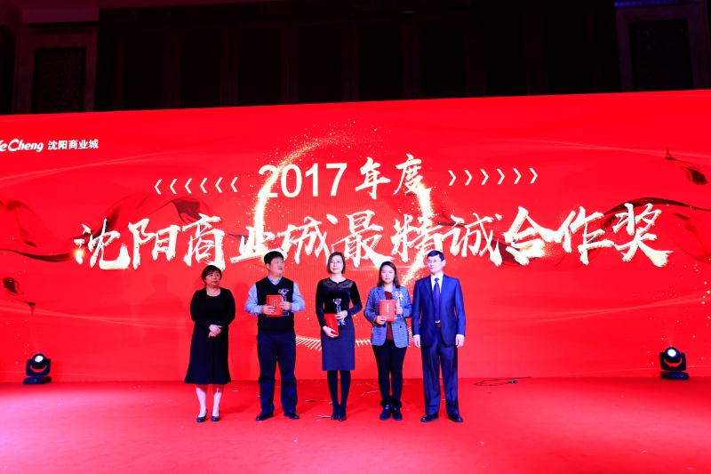 活動現場,陳哲元董事長、鐘靜總經理代表沈陽商業(yè)城向萃華金店、周大福品牌、遼寧和慧倉商貿、影兒會所頒發(fā)了2017年度最精誠合作獎。